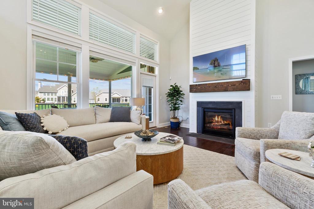 The open layout features a chef’s kitchen with granite countertops, subway tile backsplash, 42” beadboard cabinetry, GE Profile appliances, a gas cooktop, wall oven, and a large island with pendant lighting. The adjacent living room offers vaulted ceilings, a gas fireplace, and sun-filled stacked windows framing the pond view.