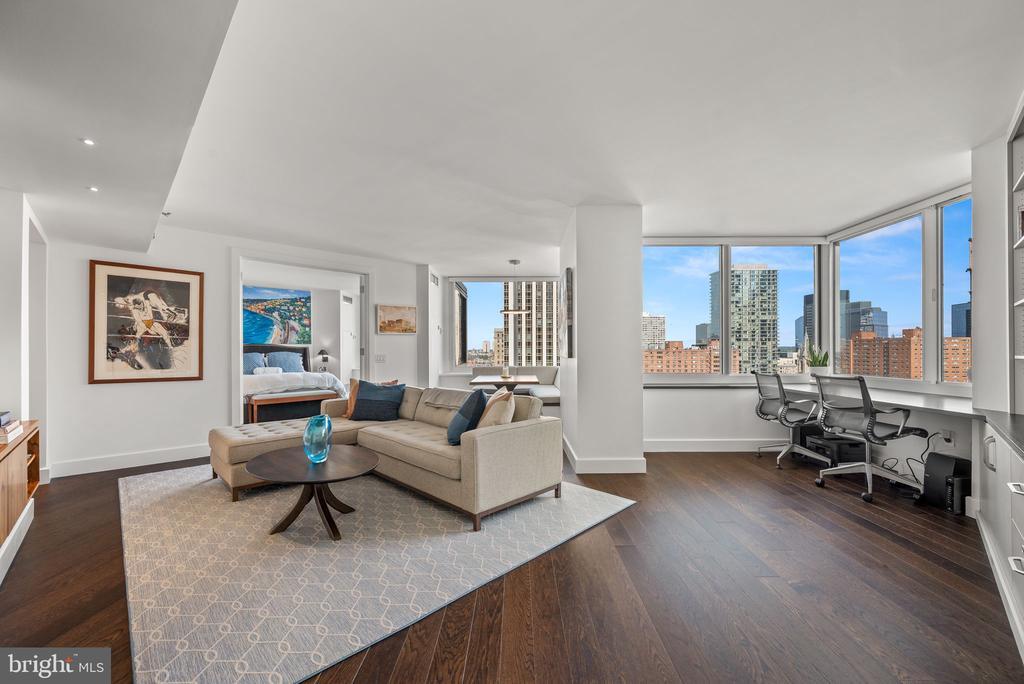 Experience seamless fusion of sophistication and convenience at The Residents of The Rittenhouse, one of Philadelphia's most coveted buildings. Encompassing over 1000 square feet of refined living space, this home boasts timeless elegance. The attention to detail is evident in this stunning redesign and renovation by Mainline Craftsman, including all new expansive windows showcasing stunning cityscapes and sunsets.The kitchen is equipped with a suite of Bosch and GE stainless steel appliances, Pappajohn master crafted cabinetry, Caesarstone counters, glass tile backsplash, a uniquely designed pantry closet, and a wine refrigerator.The great room is the heart of the home featuring a dining area with built-in banquette, a built-in corner desk and bookshelves, custom entertainment console, and a half bath. French doors lead to the bedroom with picturesque city views. The ensuite bathroom features Kohler fixtures, a walk-in shower with floor-to-ceiling mosaic tiled walls, a rain showerhead, a frameless glass door, and a customized linen closet. An oversized walk-in closet completes the suite. Additional details include wide plank oak flooring throughout, an ample hanging coat closet in the foyer, custom window treatments by The Shade Store, and new HVAC systems . This Rittenhouse Residence offers the best of urban living through the world-class services of The Rittenhouse Hotel. Enjoy the many luxury services, including full-service 24-hour concierge (dog-walking and package delivery), room service from 6 AM - 11 PM, housekeeping and laundry, chauffeur-driven Mercedes sedan, a newly renovated health club (additional fee), indoor pool, Paul Labrecque Salon, spa, Lacroix, Library Bar and Scarpetta. On-site valet parking is available for a monthly fee. The Rittenhouse is a pet-friendly building allowing dogs up to 50 pounds. Walk out your front door and enjoy the peaceful fountain, beautiful Rittenhouse Square and being only steps away from many more of the city's finest restaurants and shopping. Don’t miss the opportunity to make this beautifully designed home your own – it’s a unique find that combines style, comfort, and prime location.