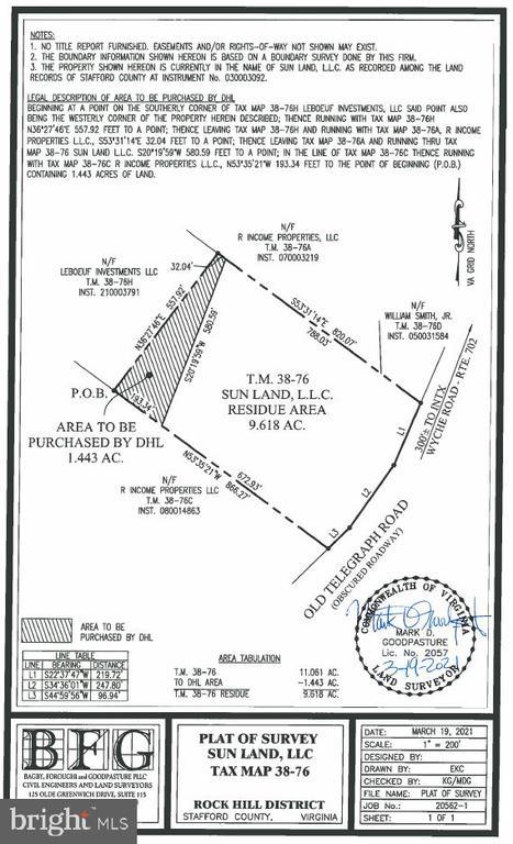 Land for sale -- 9.618 acres -- zoned B2 --- I-95 Interchange Stafford, VA Courthouse Rd. - Route 630 - East Exit 140 - Turn Right on Wyche Rd - TM38-76 on right. 9.618 acre lot immediately adjacent to 530,000+ SF Warehouse / distribution center w/ I-95 frontage. TM 38-76 to be mostly cleared, graded, and stabilized. New paved road. Lot comes with public water and sewer utility hook up on site. Electric already on site. May be combined with Adjacent additional 7.886 ac lot. TM38-76A for a larger Combined Lot of 17.5 AC. (This is a Different owner and brokerage listing) Updated tax assessment fee to be done by county. Agent related to LLC member.
